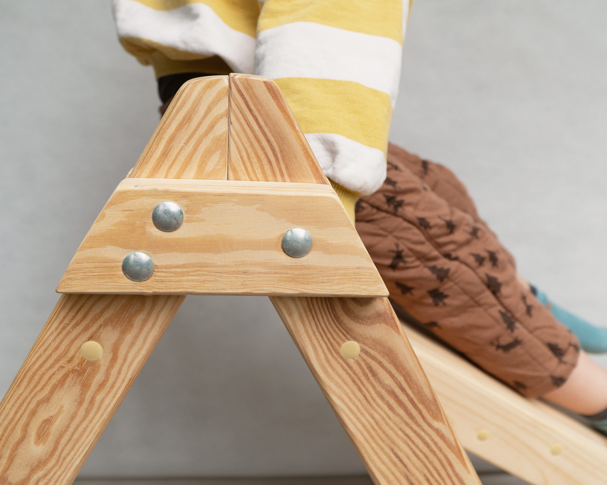 Hvert bræt kan afsluttes med kroge i begge ender, hvilket gør det muligt at fastgøre det sikkert mellem to klatretrekanter og giver endnu flere konfigurationsmuligheder og leg. (For denne mulighed, kontakt os venligst).