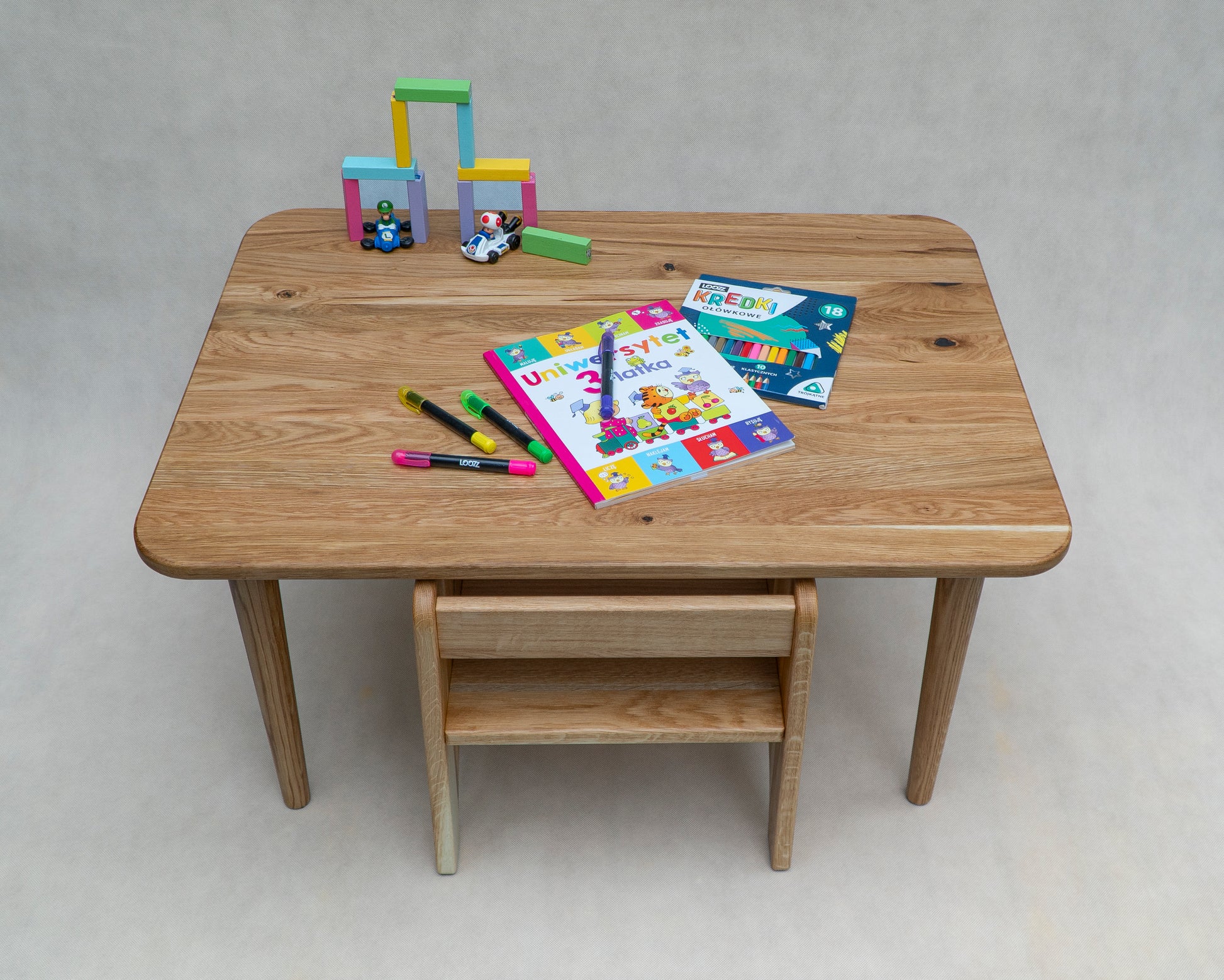 This elegant and durable oak wood table and chair set makes a thoughtful gift for toddlers and preschoolers. Crafted with smooth edges, non-toxic finishes, and a classic design, it’s ideal for activities like playing, drawing, or enjoying snacks. Each piece is handmade from solid oak, and the set is available in a range of charming colors. Suitable for children aged 1 to 4. Want to prolong the life of the table as your child grows? You can order an additional set of longer legs, making it easy to adjust the table height later by simply swapping them out.