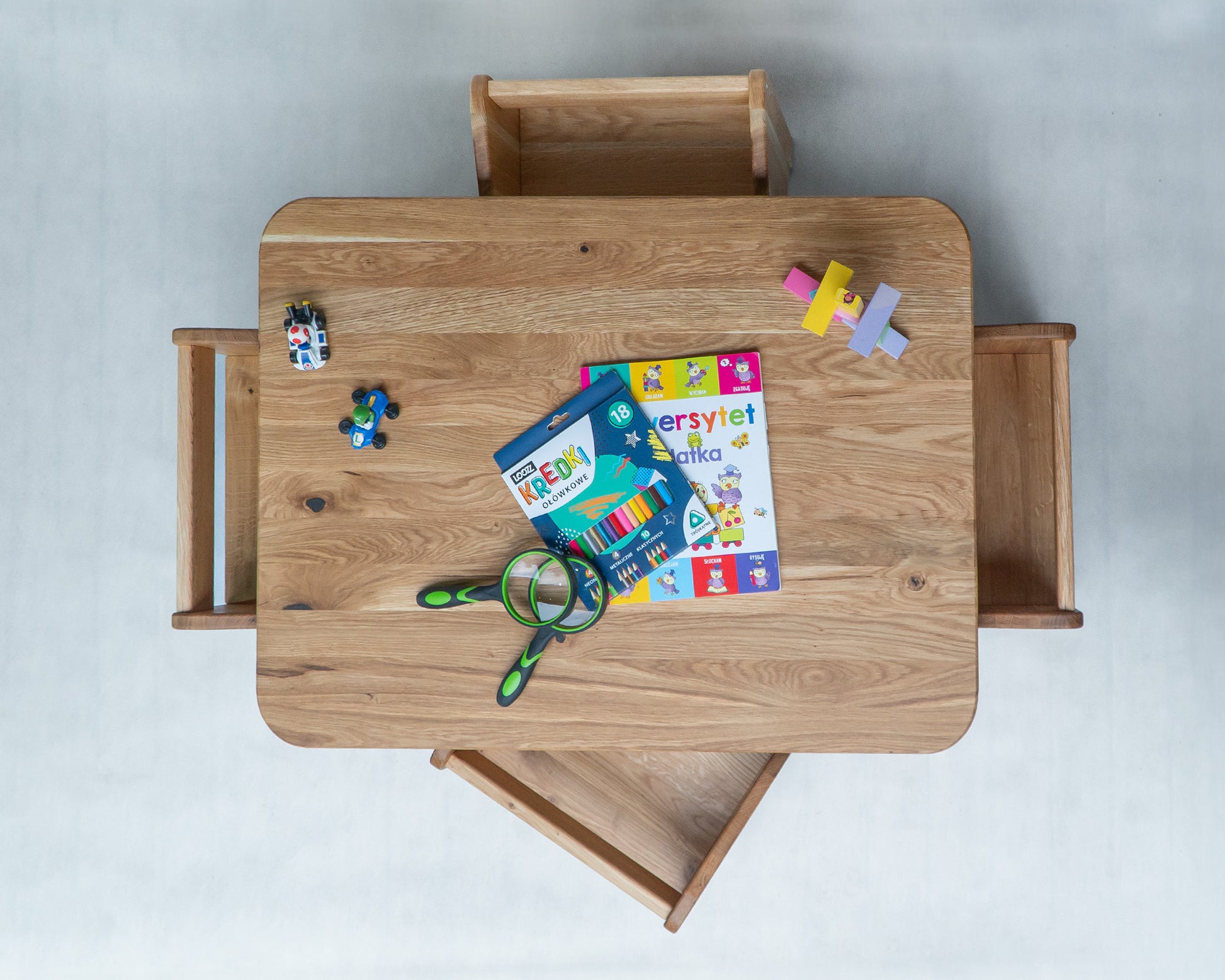 This elegant and durable oak wood table and chair set makes a thoughtful gift for toddlers and preschoolers. Crafted with smooth edges, non-toxic finishes, and a classic design, it’s ideal for activities like playing, drawing, or enjoying snacks. Each piece is handmade from solid oak, and the set is available in a range of charming colors. Suitable for children aged 1 to 4. Want to prolong the life of the table as your child grows? You can order an additional set of longer legs, making it easy to adjust the table height later by simply swapping them out.